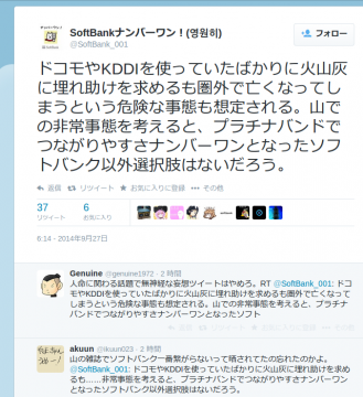 9月27日の昼前、岐阜県と長野県の県境にある標高3067mの御嶽山で、大規模な噴火が起こりました。 当時、山頂付近にいた人たちが、そのツイッターにその模様を送信していました。 惨状は、当初思われていたよりも大きく、けが人が多数出ており、重体の人も出ている模様です。 そんな中、ツイッター内で頭がおかしい人として有名な「SoftBankナンバーワン!(以下「No.1氏」と書きます」)」なるアカウントが、不謹慎な発言をして顰蹙を買い、批判の的になっています。 その発言とは、次のようなものです。 ...