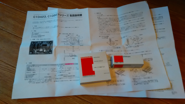 UVtronで炎を検知する 炎を検知する方法を調べていたところ浜松ホトニクス社のUVtronとその駆動回路にて炎を検知できる事が判りましたので取り寄せて実験してみることにしました。 参考URL http://eleshop.jp/shop/g/gF2H123/ 今回使用したのはUVtron R2868とその駆動回路C10807-01です。 ■制作 届いた説明書を参考にしてオープンコレクタ出力の2でテストしていたんですが、 こちらは回路が入っていない様です。 参考URL https://www.hamamatsu.com/resources/pdf/etd/C1...