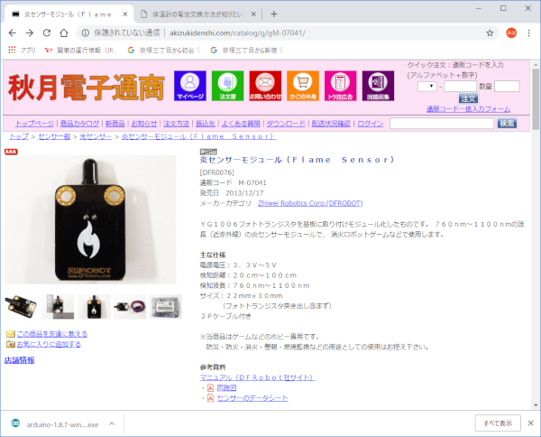 炎センサーモジュール(DFR0076)で炎を検出する 昨日に引き続き炎センサーに関する記事です。 炎センサー探しに秋葉をぶらついていたんですが、秋月にその名もFrameSensorなるセンサーがあるではないですか。 早速購入。 仕入れてから時間が経ちましたが、記事にまとめておきたいと思います。 参考URL http://akizukidenshi.com/catalog/g/gM-07041/ 秋月ページとメーカーページを見ると20cmで検出すると4.8V、100cmで検出すると1.0Vとなっております。 あまり遠くま...