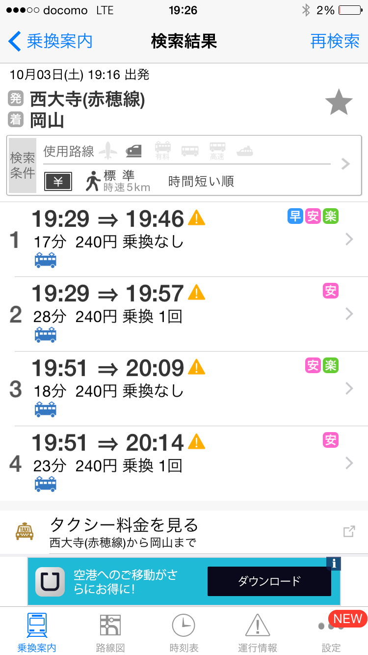 JUGEMテーマ:iPad こんにちは。 岡山市役所から徒歩5分、 ハロー!パソコン教室イトーヨーカドー岡山校 インストラクターの小川です 旅行・仕事などで電車の時間を調べる時、 駅のホームで確認し忘れたり、 確認するのに時間をとられて不便に感じたことありませんか? そんな時、アプリで便利なのが「乗り換え案内」です 今回ご紹介するのは「乗り換えNAVITIME」です。 1.出発駅と到着駅を入力します。 2.出発日時(または到着日時)を指定して、検索ボタンを押します。 すると、上記のように指定し...