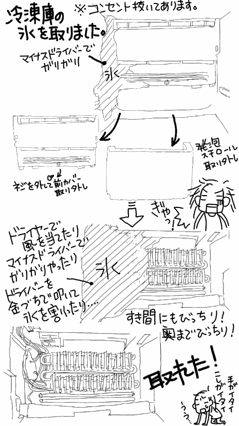 冷蔵庫、続きがありまして。 数日後に「よし、氷、取ったろか」と決心しました。 どうも冷え具合がイマイチで、こりゃよろしくないなと。 1時間くらいで終わるつもりでいざ開始。 とりあえずコンセントは抜いとこう。 何も道具がないのでマイナスドライバーで ガリガリゴリゴリ・・・・ どうしても奥の氷が取れない。 じっと見ると、パネルがネジで留められていたので このネジ取ったらもっと奥まで見えるんじゃね? と思って取って、ハマっていた爪も外したら やっぱりもう少し奥まで見えた。 引き続きガ...