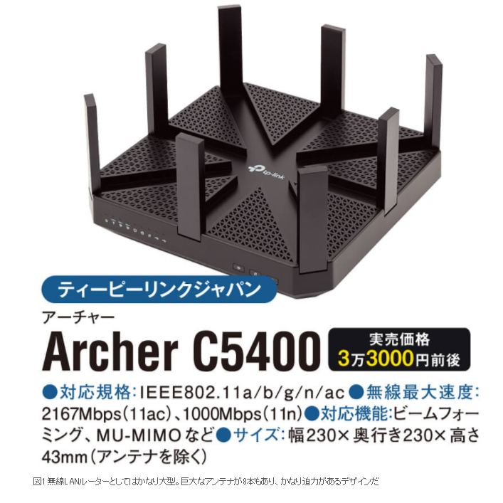 JUGEMテーマ:生活家電 無線ルーターに複数パソコンを繋ぐなら? (注)ごめんなさい、今回バッファローではないのですが・・・ 小規模なオフィスやSOHOはもちろん、店舗や家庭でも十分過ぎるぐらいのスペックを持っていておすすめなのがTP-Link社の「Archer C5400」です。 特徴を簡単に述べてみます。 ・11ac対応のアクセスポイントを2つ搭載(2167Mbps) ・11n対応のアクセスポイントを1つ搭載 ・1.4ギガデュアルコアCPU ...