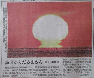 昨日の朝・・・ 私の住む皆生温泉沖の日本海では『だるま朝日』と呼ばれる 現象があったと今朝の日本海新聞に掲載されていた。 折しも湯川博士のビキニ環礁水爆実験の日記が! まるで水爆実験のキノコ雲のような「だるま朝日」 昨日の日の出が・・・ 5時6分だったが、我が家の太陽光発電は本日 5時10分に発電開始のスイッチが『カチッ』と入る。 日の出よりわずか4分後には発電開始です! ちなみに・・・ 我が家ではPanasonic HIT 5.8kwを搭載 年間の電気代は100%無料のZEHリフォーム住...