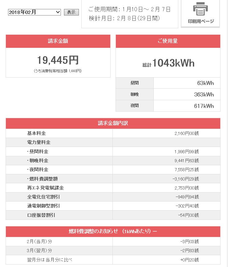 JUGEMテーマ:太陽光発電 2018年2月分(実際は1月分です)の検針記録が届きました。 うちの場合,検針期間は毎月8〜10日から次月7〜10日までの期間となります。今月(2月分)は1月10日〜2月8日までの29日間となりました。 web検針記録 先月は33日間で今月は29日間の検針なので単純比較はできませんが簡単に比較します。 購入電力量は1043kWh。昨年に比べるとだいぶ増えています。日割りにしてみると1月32.8kWh→36.0kWhとなり,約...