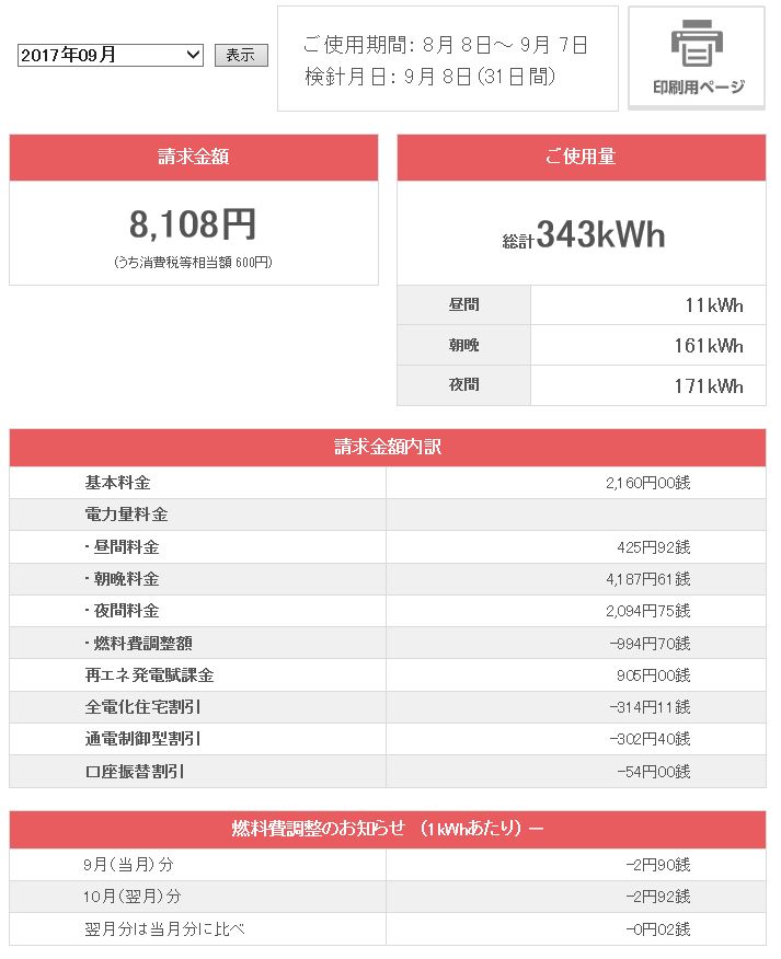 JUGEMテーマ:太陽光発電 9月分(実際は8月分です)の検針記録が届きました。 うちの場合,検針期間は毎月8〜10日から次月7〜10日までの期間となります。今月(9月分)は8月8日〜9月7日までの31日間となりました。 web検針記録 先月は29日間で今月は31日間の検針なので単純比較はできませんが,計算が面倒なので単に数値で比較します。 購入電力量は343kWh。8月が309kWhでしたので34Wh増えました。8月の東京は観測史上2位となる連続降雨日...