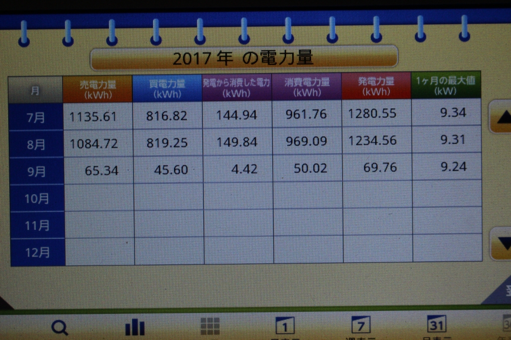 JUGEMテーマ:太陽光発電 9月の集計が出ました。 フロンティアモニターのホームエネルギーモニタリングサービスで表示された9月分の集計結果です。 まずは総消費電力ですが,8月よりはよかったとはいえ今月もあまり晴れの日がなく気温も比較的低めでしたので,519.53kWhと先月(567.17kWh)よりだいぶ減りました。エアコンなしで過ごせる日が多くなりました。 発電総量は841.01kWhと,天気の悪かった先月782.90kWhよりもよかったとはいえ,4桁の大台にはほど遠いも...