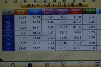 JUGEMテーマ:太陽光発電 皆様こんばんは、毎度ご訪問ありがとうございます。 熊本県で太陽光発電を設置し、毎日の発電量を記載しています。 電気管理技術者でもある51歳 papaと申します。 Profileもご覧下さいませ^^/ 2017年1月15日週の電力量がでました。 晴れの割合が多い週でした。 右から2列目の赤のラインが発電力量となります。 9.26〜42.82KWHと まばらな値になりました。 一番左の列が売電力量です。 一週間の...