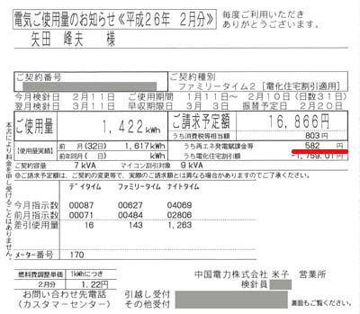 全国の・・・ 電気を購入しているご家庭には「もれなく」付いている 検針票の片隅に再エネ賦課金とちょこっと書いてあります。 最近は・・・ ペーパーレスで、電気料金などはネットで見る時代。 なので、その都度PCを開かないと明細が分かりませんよね。 検針票の・・・ 中程に書いてある『再エネ賦課金』を平成26年の2月と 令和2年の2月を比較してみました。 平成26年は・・・ 蓄熱暖房機を使っていたので1,422KWhの使用量に対し 再エネ賦課金はKWあたり0.4円だったので¥582です。 ...