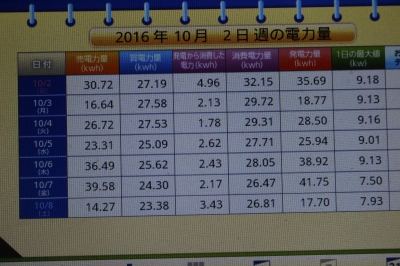 JUGEMテーマ:太陽光発電 皆様こんばんは、毎度ご訪問ありがとうございます。 熊本県で太陽光発電を設置し、毎日の発電量を記載しています。 電気管理技術者でもある51歳 papaと申します。 Profileもご覧下さいませ^^/ 2016年10月2日週の電力量がでました。 曇り空の割合が多い週でした。 右から2列目の赤のラインが発電力量となります。 17.70〜41.75KWHと まばらな値になりました。 一番左の列が売電力量です。 一週間の...