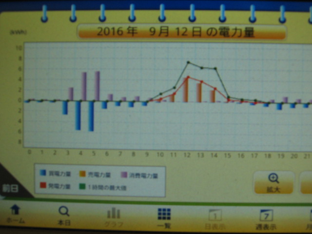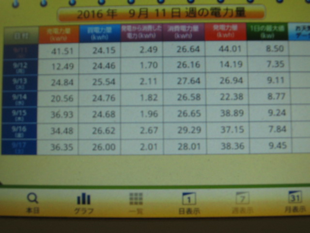 JUGEMテーマ:太陽光発電 皆様こんばんは、毎度ご訪問ありがとうございます。 熊本県で太陽光発電を設置し、毎日の発電量を記載しています。 電気管理技術者でもある51歳 papaと申します。 Profileもご覧下さいませ^^/ 2016年9月11日週の電力量がでました。 曇り空の割合が多い週でした。 右から2列目の赤のラインが発電力量となります。 14.19〜44.01KWHと まばらな値になりました。 一番左の列が売電力量です。 一週間の...