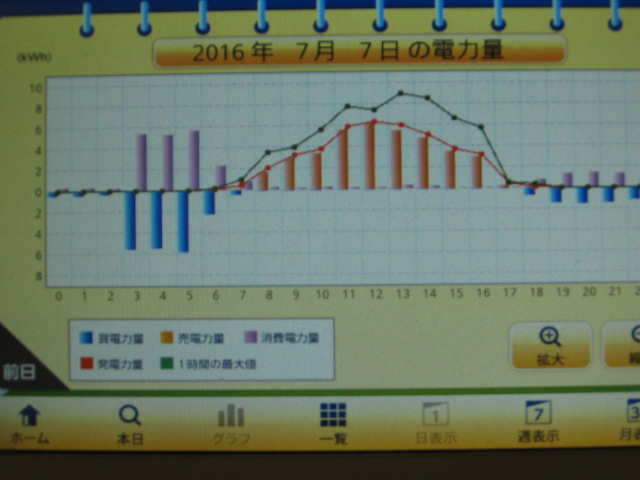 JUGEMテーマ:太陽光発電 皆様こんばんは、毎度ご訪問ありがとうございます。 熊本県で太陽光発電を設置し、毎日の発電量を記載しています。 電気管理技術者でもある51歳 papaと申します。 Profileもご覧下さいませ^^/ 7月7日の電力量24時間棒グラフです。 通常、太陽光発電は太陽の光により 発電を行います。 現在は、お家を基準として 日の出ごろの5時20分から 日の入りごろ19時25分の間で 発電が行われています。 橙...