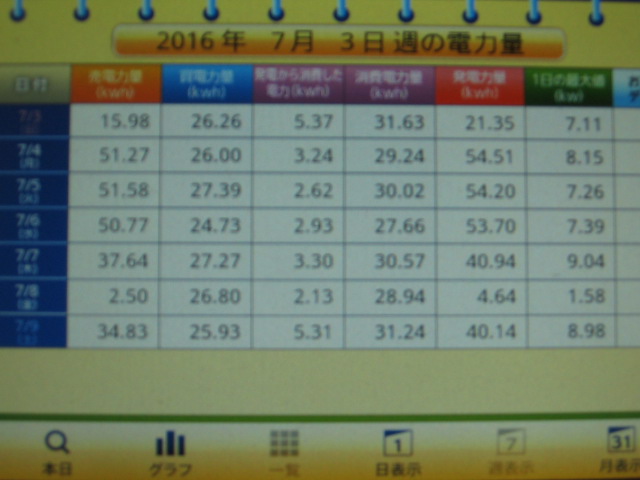 JUGEMテーマ:太陽光発電 皆様こんばんは、毎度ご訪問ありがとうございます。 熊本県で太陽光発電を設置し、毎日の発電量を記載しています。 電気管理技術者でもある51歳 papaと申します。 Profileもご覧下さいませ^^/ 2016年7月3日週の電力量がでました。 前半晴れが多く、後半は曇り雨となりました。 右から2列目の赤のラインが発電力量となります。 4.64〜54.51KWHと まばらな値になりました。 一番左の列が売電力量で...