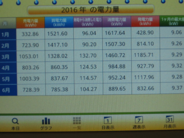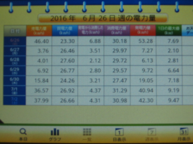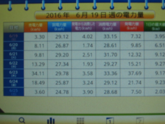 JUGEMテーマ:太陽光発電 皆様こんばんは、毎度ご訪問ありがとうございます。 熊本県で太陽光発電を設置し、毎日の発電量を記載しています。 電気管理技術者でもある51歳 papaと申します。 Profileもご覧下さいませ^^/ 2016年6月19日週の電力量がでました。 雨の日が多い週になりました。 右から2列目の赤のラインが発電力量となります。 7.32〜37.69KWHと まばらな値になりました。 一番左の列が売電力量です。 一週間の...