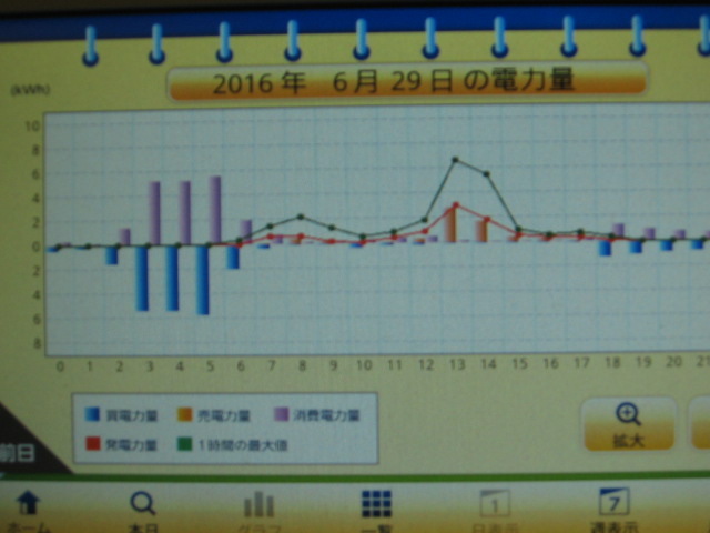JUGEMテーマ:太陽光発電 皆様こんばんは、毎度ご訪問ありがとうございます。 熊本県で太陽光発電を設置し、毎日の発電量を記載しています。 電気管理技術者でもある51歳 papaと申します。 Profileもご覧下さいませ^^/ 6月29日の電力量24時間棒グラフです。 通常、太陽光発電は太陽の光により 発電を行います。 現在は、お家を基準として 日の出ごろの5時10分から 日の入りごろ19時25分の間で 発電が行われています。 橙...