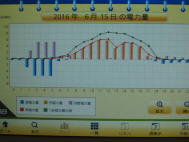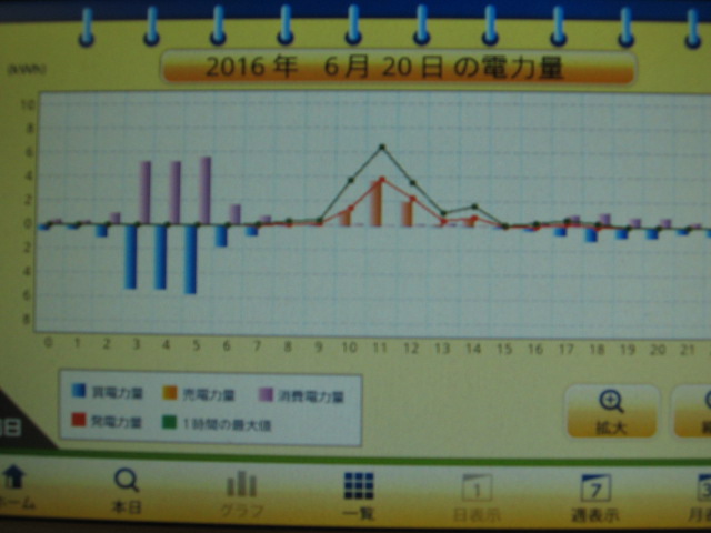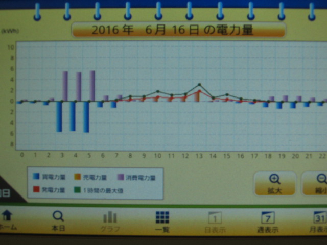 JUGEMテーマ:太陽光発電 皆様こんばんは、毎度ご訪問ありがとうございます。 熊本県で太陽光発電を設置し、毎日の発電量を記載しています。 電気管理技術者でもある51歳 papaと申します。 Profileもご覧下さいませ^^/ 6月16日の電力量24時間棒グラフです。 通常、太陽光発電は太陽の光により 発電を行います。 現在は、お家を基準として 日の出ごろの5時10分から 日の入りごろ19時20分の間で 発電が行われています。 橙色の部分が発電量となります。 16日は、朝から雨が降っており 一日...