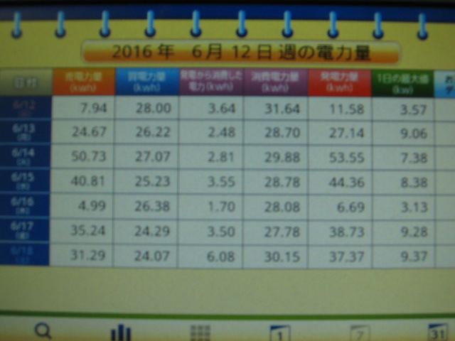 JUGEMテーマ:太陽光発電 皆様こんばんは、毎度ご訪問ありがとうございます。 熊本県で太陽光発電を設置し、毎日の発電量を記載しています。 電気管理技術者でもある51歳 papaと申します。 Profileもご覧下さいませ^^/ 2016年6月12日週の電力量がでました。 曇りの日が多い週になりました。 右から2列目の赤のラインが発電力量となります。 6.69〜53.55KWHと まばらな値になりました。 一番左の列が売電力量です。 一週間の合計が19...