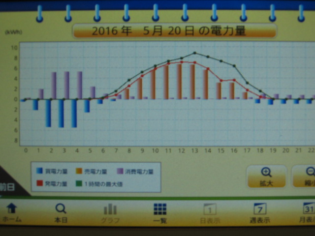 JUGEMテーマ:太陽光発電 皆様こんばんは、毎度ご訪問ありがとうございます。 熊本県で太陽光発電を設置し、毎日の発電量を記載しています。 電気管理技術者でもある51歳 papaと申します。 Profileもご覧下さいませ^^/ 5月20日の電力量24時間棒グラフです。 通常、太陽光発電は太陽の光により 発電を行います。 現在は、お家を基準として 日の出ごろの5時35分から 日の入りごろ18時55分の間で 発電が行われています。 橙色の部分が発電量となります。 20日は、朝から太陽さまが顔を出し ...