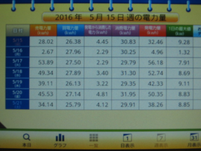 JUGEMテーマ:太陽光発電 皆様こんばんは、毎度ご訪問ありがとうございます。 熊本県で太陽光発電を設置し、毎日の発電量を記載しています。 電気管理技術者でもある51歳 papaと申します。 Profileもご覧下さいませ^^/ 2016年5月15日週の電力量がでました。 後半に晴れたって感じの週になりました。 右から2列目の赤のラインが発電力量となります。 4.96〜56.18KWHと まばらな値になりました。 一番左の列が売電力量です。 一週間の合計が252.70KWHとなりました。 1KWHの単価が37円なので ...