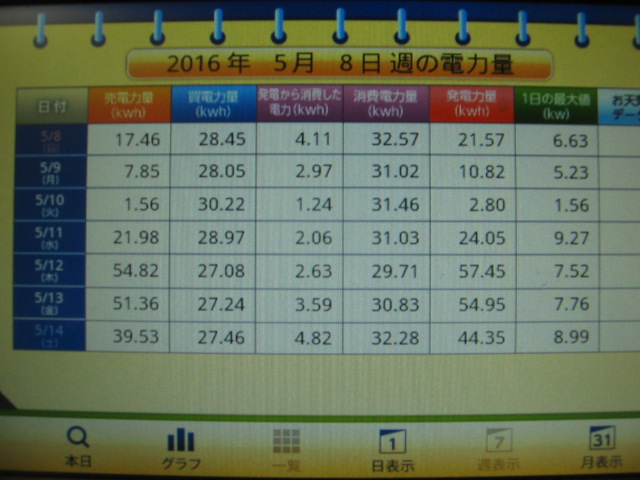JUGEMテーマ:太陽光発電 皆様こんばんは、毎度ご訪問ありがとうございます。 熊本県で太陽光発電を設置し、毎日の発電量を記載しています。 電気管理技術者でもある51歳 papaと申します。 Profileもご覧下さいませ^^/ 2016年5月8日週の電力量がでました。 後半に晴れたって感じの週になりました。 右から2列目の赤のラインが発電力量となります。 2.80〜57.45KWHと まばらな値になりました。 一番左の列が売電力量です。 一週間の合計が194.56KWHとなりました。 1KWHの単価が37円なので ...