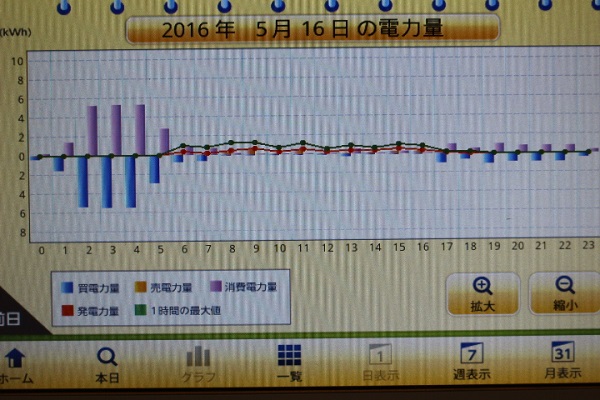 JUGEMテーマ:太陽光発電 皆様こんばんは、毎度ご訪問ありがとうございます。 熊本県で太陽光発電を設置し、毎日の発電量を記載しています。 電気管理技術者でもある51歳 papaと申します。 Profileもご覧下さいませ^^/ 5月16日の電力量24時間棒グラフです。 通常、太陽光発電は太陽の光により 発電を行います。 現在は、お家を基準として 日の出ごろの5時35分から 日の入りごろ18時55分の間で 発電が行われています。 橙色の部分が発電量となります。 16日は、朝から雨が降り出し 一日中...