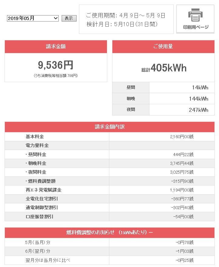 JUGEMテーマ:太陽光発電 2019年5月分(実際は4月分です)の検針記録が届きました。 うちの場合,検針期間は毎月8〜10日から次月7〜10日までの期間となります。今月(5月分)は4月9日〜5月9日までの31日間となりました。 web検針記録 購入電力量は405kWh。先月576kWhより171kWh減少です。 床暖房もエアコンも無使用で過ごせるイイ季節になりました。 検針記録の内訳は次のようになっています。最下段が今月の内訳です。 昨年同...