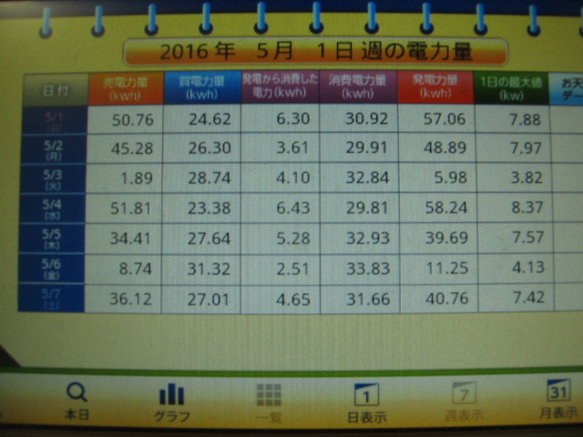 JUGEMテーマ:太陽光発電 皆様こんばんは、毎度ご訪問ありがとうございます。 熊本県で太陽光発電を設置し、毎日の発電量を記載しています。 電気管理技術者でもある51歳 papaと申します。 Profileもご覧下さいませ^^/ 2016年5月1日週の電力量がでました。 晴れた日が多い週になりました。 右から2列目の赤のラインが発電力量となります。 5.98〜58.24KWHと まばらな値になりました。 一番左の列が売電力量です。 一週間の合計が229.01KWHとなりました。 1KWHの単価が37円なので 8473円...