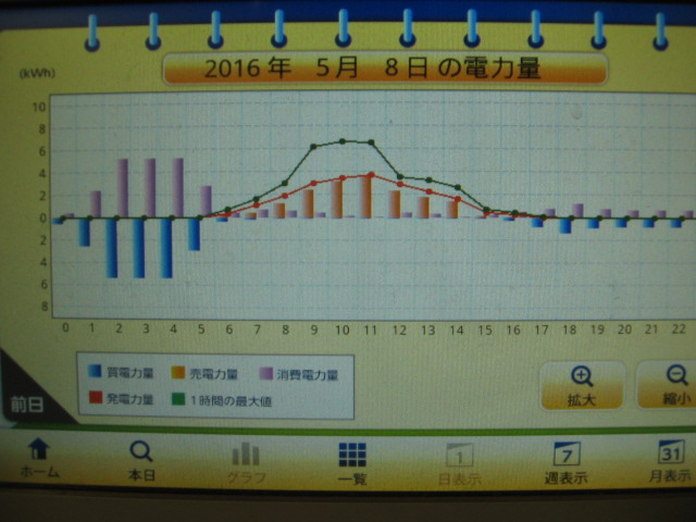 JUGEMテーマ:太陽光発電 皆様こんばんは、毎度ご訪問ありがとうございます。 熊本県で太陽光発電を設置し、毎日の発電量を記載しています。 電気管理技術者でもある51歳 papaと申します。 Profileもご覧下さいませ^^/ 5月8日の電力量24時間棒グラフです。 通常、太陽光発電は太陽の光により 発電を行います。 現在は、お家を基準として 日の出ごろの5時40分から 日の入りごろ18時50分の間で 発電が行われています。 橙色の部分が発電量となります。 8日は、朝から曇り空でしたが お昼過...