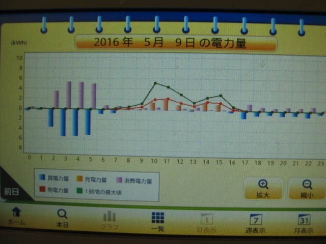 JUGEMテーマ:太陽光発電 皆様こんばんは、毎度ご訪問ありがとうございます。 熊本県で太陽光発電を設置し、毎日の発電量を記載しています。 電気管理技術者でもある51歳 papaと申します。 Profileもご覧下さいませ^^/ 5月9日の電力量24時間棒グラフです。 通常、太陽光発電は太陽の光により 発電を行います。 現在は、お家を基準として 日の出ごろの5時40分から 日の入りごろ18時50分の間で 発電が行われています。 橙色の部分が発電量となります。 9日は、朝から雨が降り ほぼ一日中雨...