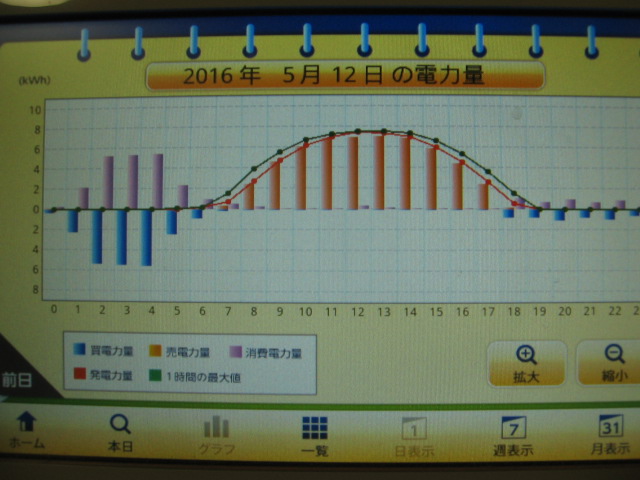 JUGEMテーマ:太陽光発電 皆様こんばんは、毎度ご訪問ありがとうございます。 熊本県で太陽光発電を設置し、毎日の発電量を記載しています。 電気管理技術者でもある51歳 papaと申します。 Profileもご覧下さいませ^^/ 5月12日の電力量24時間棒グラフです。 通常、太陽光発電は太陽の光により 発電を行います。 現在は、お家を基準として 日の出ごろの5時35分から 日の入りごろ18時55分の間で 発電が行われています。 橙色の部分が発電量となります。 12日は、朝から太陽様が顔をだし 久...