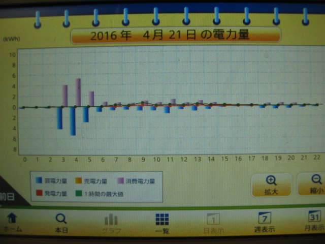 JUGEMテーマ:太陽光発電 皆様こんばんは、毎度ご訪問ありがとうございます。 熊本県で太陽光発電を設置し、毎日の発電量を記載しています。 電気管理技術者でもある51歳 papaと申します。 Profileもご覧下さいませ^^/ 4月21日の電力量24時間棒グラフです。 通常、太陽光発電は太陽の光により 発電を行います。 現在は、お家を基準として 日の出ごろの5時55分から 日の入りごろ18時40分の間で 発電が行われています。 橙色の部分が発電量となります。 21日は、朝から雨が降って 日...