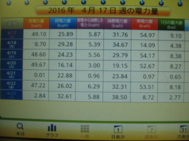 JUGEMテーマ:太陽光発電 皆様こんばんは、毎度ご訪問ありがとうございます。 熊本県で太陽光発電を設置し、毎日の発電量を記載しています。 電気管理技術者でもある51歳 papaと申します。 Profileもご覧下さいませ^^/ 2016年4月17日週の電力量がでました。 やや晴れの日が多い週になりました。 右から2列目の赤のラインが発電力量となります。 0.97〜54.97KWHと まばらな値になりました。 一番左の列が売電力量です。 一週間の合計が206.16KWHとなりました。 1KWHの単価が37円なので 7...