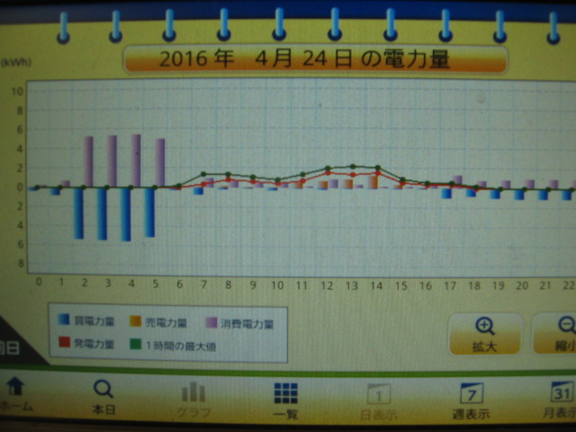 JUGEMテーマ:太陽光発電 皆様こんばんは、毎度ご訪問ありがとうございます。 熊本県で太陽光発電を設置し、毎日の発電量を記載しています。 電気管理技術者でもある51歳 papaと申します。 Profileもご覧下さいませ^^/ 4月24日の電力量24時間棒グラフです。 通常、太陽光発電は太陽の光により 発電を行います。 現在は、お家を基準として 日の出ごろの5時55分から 日の入りごろ18時40分の間で 発電が行われています。 橙色の部分が発電量となります。 24日は、朝から曇り空でしたが やが...