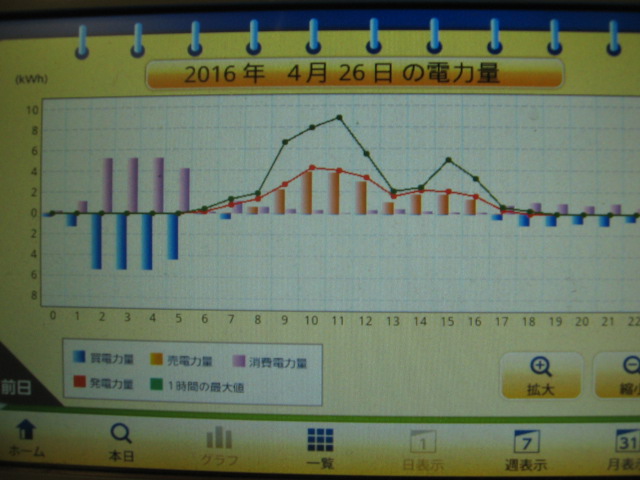 JUGEMテーマ:太陽光発電 皆様こんばんは、毎度ご訪問ありがとうございます。 熊本県で太陽光発電を設置し、毎日の発電量を記載しています。 電気管理技術者でもある51歳 papaと申します。 Profileもご覧下さいませ^^/ 4月26日の電力量24時間棒グラフです。 通常、太陽光発電は太陽の光により 発電を行います。 現在は、お家を基準として 日の出ごろの5時40分から 日の入りごろ18時50分の間で 発電が行われています。 橙色の部分が発電量となります。 26日は、朝から曇り空で 一日中曇り...