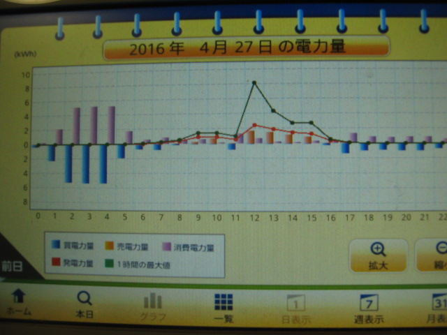 JUGEMテーマ:太陽光発電 皆様こんばんは、毎度ご訪問ありがとうございます。 熊本県で太陽光発電を設置し、毎日の発電量を記載しています。 電気管理技術者でもある51歳 papaと申します。 Profileもご覧下さいませ^^/ 4月27日の電力量24時間棒グラフです。 通常、太陽光発電は太陽の光により 発電を行います。 現在は、お家を基準として 日の出ごろの5時40分から 日の入りごろ18時50分の間で 発電が行われています。 橙色の部分が発電量となります。 27日は、朝から雨模様で ほぼ一日中...