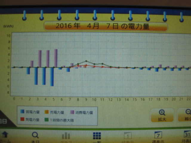 JUGEMテーマ:太陽光発電 皆様こんばんは、毎度ご訪問ありがとうございます。 熊本県で太陽光発電を設置し、毎日の発電量を記載しています。 電気管理技術者でもある51歳 papaと申します。 Profileもご覧下さいませ^^/ 4月7日の電力量24時間棒グラフです。 通常、太陽光発電は太陽の光により 発電を行います。 現在は、お家を基準として 日の出ごろの6時15分から 日の入りごろ18時35分の間で 発電が行われています。 橙色の部分が発電量となります。 7日は、朝から雨となり 春の嵐になり...
