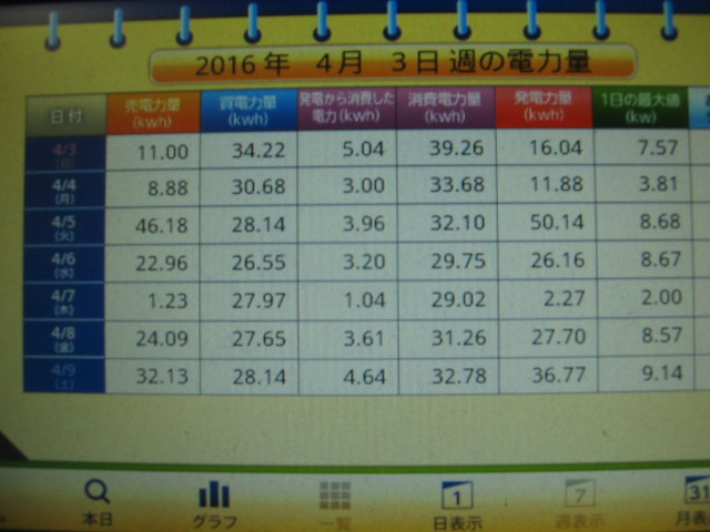 JUGEMテーマ:太陽光発電 皆様こんばんは、毎度ご訪問ありがとうございます。 熊本県で太陽光発電を設置し、毎日の発電量を記載しています。 電気管理技術者でもある51歳 papaと申します。 Profileもご覧下さいませ^^/ 2016年4月3日週の電力量がでました。 やや曇りの日が多い週になりました。 右から2列目の赤のラインが発電力量となります。 2.27〜50.14KWHと まばらな値になりました。 一番左の列が売電力量です。 一週間の合計が146.47KWHとなりました。 1KWHの単価が37円なので 5419...