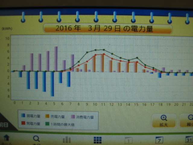 JUGEMテーマ:太陽光発電 皆様こんばんは、毎度ご訪問ありがとうございます。 熊本県で太陽光発電を設置し、毎日の発電量を記載しています。 電気管理技術者でもある51歳 papaと申します。 Profileもご覧下さいませ^^/ 3月29日の電力量24時間棒グラフです。 通常、太陽光発電は太陽の光により 発電を行います。 現在は、お家を基準として 日の出ごろの6時35分から 日の入りごろ18時30分の間で 発電が行われています。 橙色の部分が発電量となります。 29日は、朝からは晴れていましたが ...