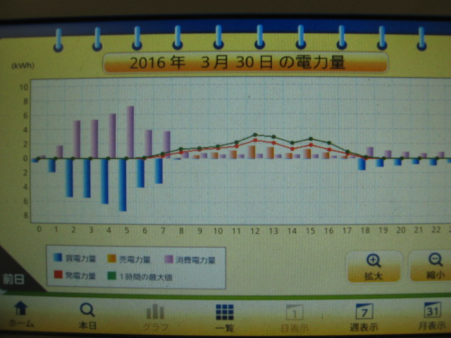 JUGEMテーマ:太陽光発電 皆様こんばんは、毎度ご訪問ありがとうございます。 熊本県で太陽光発電を設置し、毎日の発電量を記載しています。 電気管理技術者でもある51歳 papaと申します。 Profileもご覧下さいませ^^/ 3月30日の電力量24時間棒グラフです。 通常、太陽光発電は太陽の光により 発電を行います。 現在は、お家を基準として 日の出ごろの6時35分から 日の入りごろ18時30分の間で 発電が行われています。 橙色の部分が発電量となります。 30日は、朝から曇り空でほぼ 一日中...