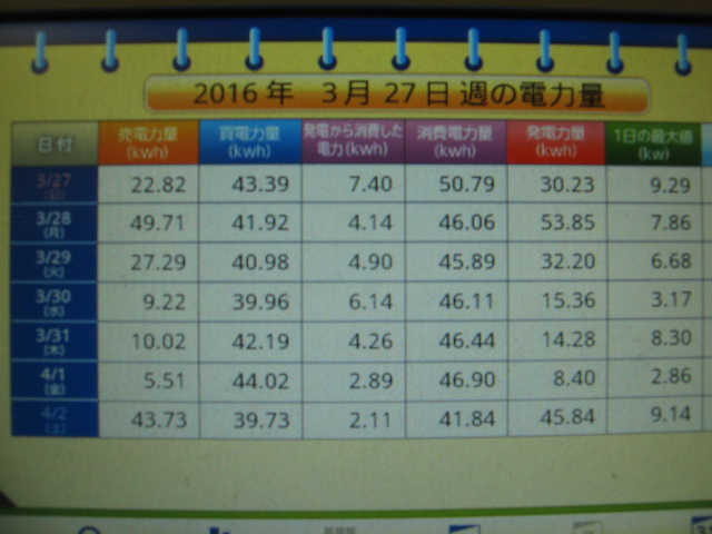 JUGEMテーマ:太陽光発電 皆様こんばんは、毎度ご訪問ありがとうございます。 熊本県で太陽光発電を設置し、毎日の発電量を記載しています。 電気管理技術者でもある51歳 papaと申します。 Profileもご覧下さいませ^^/ 2016年3月27日週の電力量がでました。 やや曇りの日が多い週になりました。 右から2列目の赤のラインが発電力量となります。 8.40〜53.85KWHと まばらな値になりました。 一番左の列が売電力量です。 一週間の合計が168.3KWHとなりました。 1KWHの単価が37円なので 62...