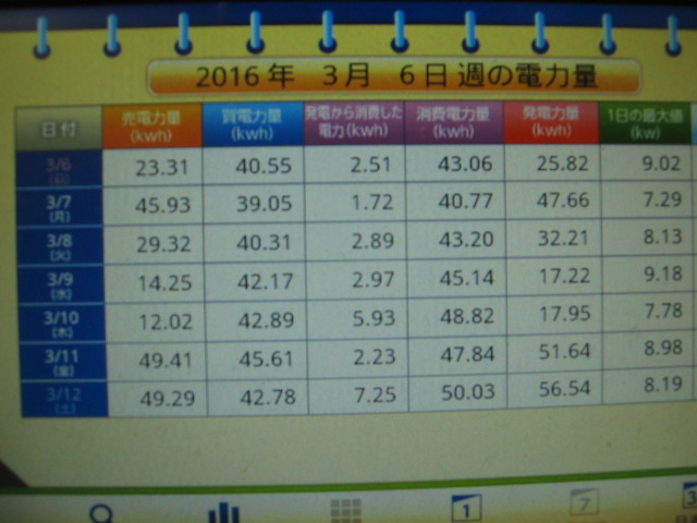 JUGEMテーマ:太陽光発電 皆様こんばんは、毎度ご訪問ありがとうございます。 熊本県で太陽光発電を設置し、毎日の発電量を記載しています。 電気管理技術者でもある51歳 papaと申します。 Profileもご覧下さいませ^^/ 2016年2月28日週の電力量がでました。 晴れの日と曇りの日が半々の週となりました。 右から2列目の赤のラインが発電力量となります。 17.22〜56.54KWHと まばらな値になりました。 一番左の列が売電力量です。 一週間の合計が223.53KWHとなりました。 1KWHの単価が37円な...