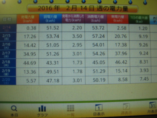 JUGEMテーマ:太陽光発電 皆様こんばんは、毎度ご訪問ありがとうございます。 熊本県で太陽光発電を設置し、毎日の発電量を記載しています。 電気管理技術者でもある51歳 papaと申します。 Profileもご覧下さいませ^^/ 2016年2月14日週の電力量がでました。 安定しない天気の週となりました。 右から2列目の赤のラインが発電力量となります。 2.58〜46.42KWHと まばらな値になりました。 一番左の列が売電力量です。 一週間の合計が130.63KWHとなりました。 1KWHの単価が37円なので 483...