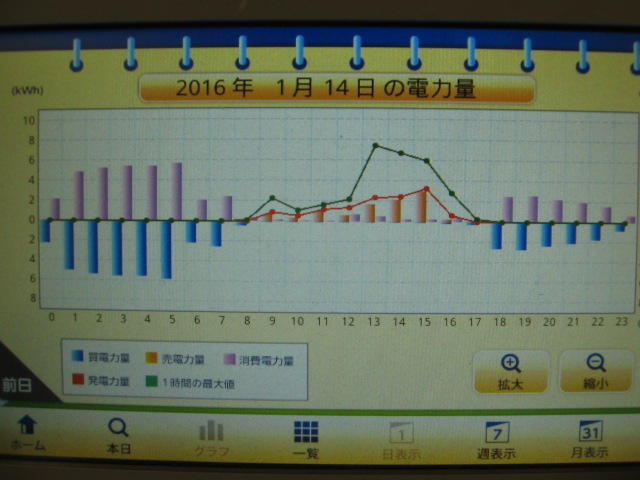 JUGEMテーマ:太陽光発電 皆様こんばんは、毎度ご訪問ありがとうございます。 熊本県で太陽光発電を設置し、毎日の発電量を記載しています。 電気管理技術者でもある50歳 papaと申します。 Profileもご覧下さいませ^^/ 1月14日の電力量24時間棒グラフです。 通常、太陽光発電は太陽の光により 発電を行います。 現在は、お家を基準として 日の出ごろの7時25分から 日の入りごろ17時10分の間で 発電が行われています。 橙色の部分が発電量となります。 14日は、朝から曇り空で ほぼ一...