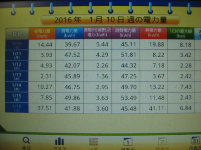 JUGEMテーマ:太陽光発電 皆様こんばんは、毎度ご訪問ありがとうございます。 熊本県で太陽光発電を設置し、毎日の発電量を記載しています。 電気管理技術者でもある50歳 papaと申します。 Profileもご覧下さいませ^^/ 2016年1月10日週の電力量がでました。 くもりの日が多い週となりました。 右から2列目の赤のラインが発電力量となります。 2.31〜37.51KWHと まばらな値になりました。 一番左の列が売電力量です。 一週間の合計が81.24KWHとなりました。 1KWHの単価が37円なので ...