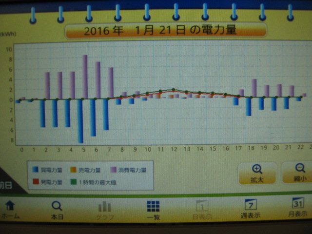 JUGEMテーマ:太陽光発電 皆様こんばんは、毎度ご訪問ありがとうございます。 熊本県で太陽光発電を設置し、毎日の発電量を記載しています。 電気管理技術者でもある50歳 papaと申します。 Profileもご覧下さいませ^^/ 1月21日の電力量24時間棒グラフです。 通常、太陽光発電は太陽の光により 発電を行います。 現在は、お家を基準として 日の出ごろの7時25分から 日の入りごろ17時10分の間で 発電が行われています。 橙色の部分が発電量となります。 21日は、朝から濃い曇り空となり...