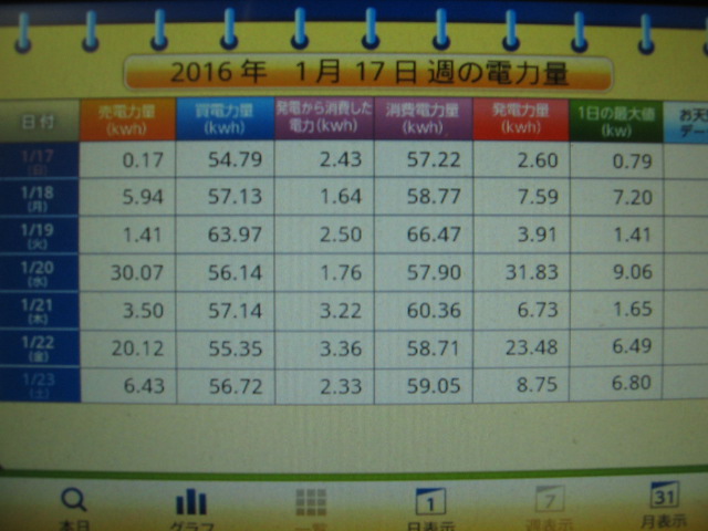 JUGEMテーマ:太陽光発電 皆様こんばんは、毎度ご訪問ありがとうございます。 熊本県で太陽光発電を設置し、毎日の発電量を記載しています。 電気管理技術者でもある50歳 papaと申します。 Profileもご覧下さいませ^^/ 2016年1月17日週の電力量がでました。 くもりの日が多い週となりました。 右から2列目の赤のラインが発電力量となります。 2.60〜31.83KWHと まばらな値になりました。 一番左の列が売電力量です。 一週間の合計が67.64KWHとなりました。 1KWHの単価が37円なので ...