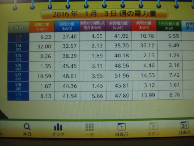 JUGEMテーマ:太陽光発電 男性のための恋愛術成功法則リンク 皆様こんばんは、毎度ご訪問ありがとうございます。 熊本県で太陽光発電を設置し、毎日の発電量を記載しています。 電気管理技術者でもある50歳 papaと申します。 Profileもご覧下さいませ^^/ 2016年1月3日週の電力量がでました。 くもりの日が多い週となりました。 右から2列目の赤のラインが発電力量となります。 2.15〜35.12KWHと まばらな値になりました。 一番左の列が売電力量です。 一週間の合計が60.23KWHとなりました...