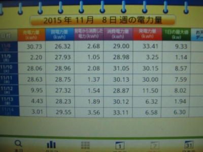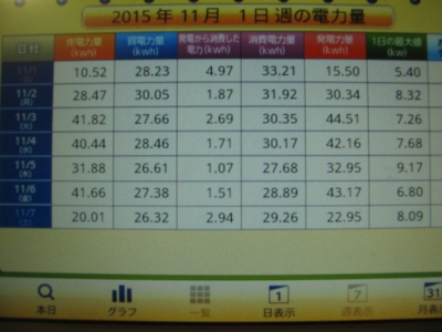 JUGEMテーマ:太陽光発電 皆様こんばんは、毎度ご訪問ありがとうございます。 熊本県で太陽光発電を設置し、毎日の発電量を記載しています。 電気管理技術者でもある50歳 papaと申します。 Profileもご覧下さいませ^^/ 2015年11月8日週の電力量がでました。 全天候晴れの日ばかりの週となりました。 右から2列目の赤のラインが発電力量となります。 3.25〜33.41KWHと まばらな値になりました。 一番左の列が売電力量です。 一週間の合計が107.01KWHとなりました。 1KWHの単価が3...