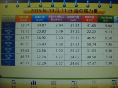 JUGEMテーマ:太陽光発電 皆様こんばんは、毎度ご訪問ありがとうございます。 熊本県で太陽光発電を設置し、毎日の発電量を記載しています。 電気管理技術者でもある50歳 papaと申します。 Profileもご覧下さいませ^^/ 2015年10月11日週の電力量がでました。 全体的に晴れの日の割合が 多い週でした。 右から2列目の赤のラインが発電力量となります。 22.22〜50.74KWHと割合 まばらな値となりました。 一番左の列が売電力量です。 一週間の合計が272.97KWHとなりました。 1KWHの単価...