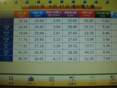 JUGEMテーマ:太陽光発電 皆様こんばんは、毎度ご訪問ありがとうございます。 熊本県で太陽光発電を設置し、毎日の発電量を記載しています。 電気管理技術者でもある50歳 papaと申します。 Profileもご覧下さいませ^^/ 2015年9月20日週の電力量がでました。 全体を見て曇りの日が多く 週末に晴れて伸びているようでした。 右から2列目の赤のラインが発電力量となります。 13.71〜52.45KWHと割合 まばらな値となりました。 一番左の列が売電力量です。 一週間の合計が196.4KWHとなりまし...