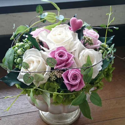 JUGEMテーマ:プリザーブドフラワー プリザーブドフラワーのアレンジで ナチュラル感を出したいときは、 何種類かのグリーンをいれると出てくるのですが、 プリザーブドフラワーのグリーンはそんなに種類が ないため、そんな時にはアートをあわせていきます。 アレンジの周りに巻きつけるようなデザインで作ってみました。 ご結婚のお祝い用フラワーギフトなので、白いバラを メインに幸せのピンクをアクセントカラーで添えました。 周りに使っているグリ...